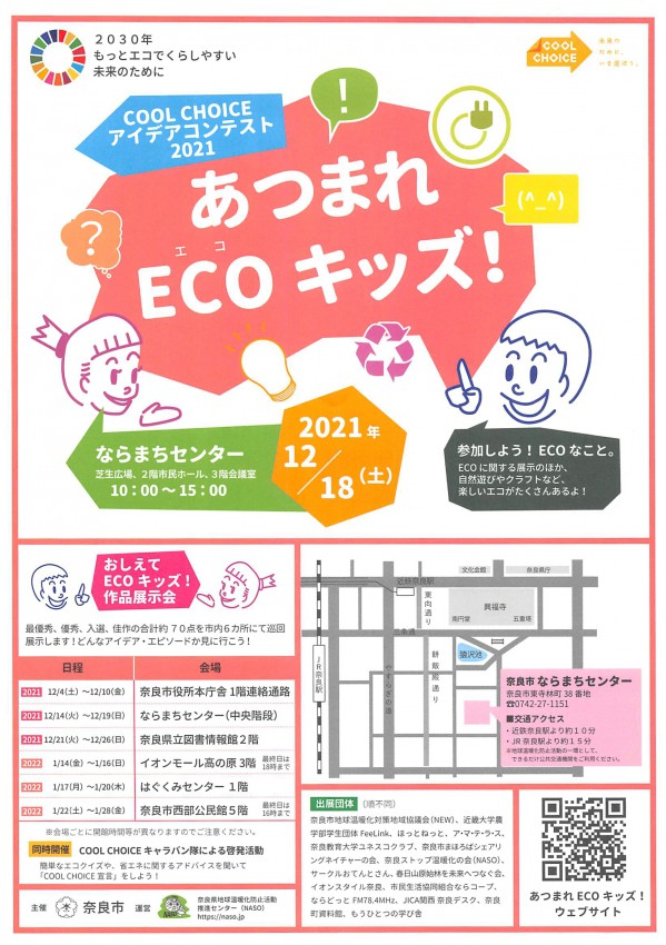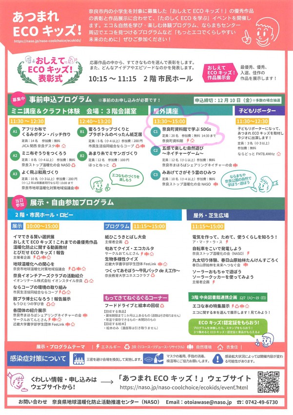 奈良市内の小学生を対象に募集した「おしえてECOキッズ!」の優秀作品の表彰と作品展示に合わせて、「たのしくECOを学」イベントを開催します。エコ&自然を学び・楽しむ体験プログラム、ならまちセンター周辺でエコを見つけるプログラムなど「もっとエコでくらしやすい未来のために」
