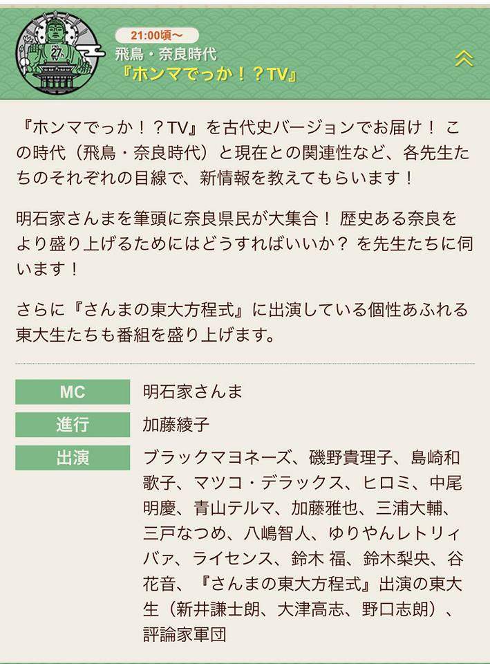 Tv御案内 2017年9月9日(土)21時頃~ フジテレビ27時間 『ほんまでっかテレビ』 奈良を紹介して頂きました! 身代り申も一緒に、三戸なつめさんが紹介してくれました。!(^^)! 奈良町資料館 【年中無休・入館無料】